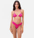Bikini con top triangolo con drappeggio su coppa; Coppe estraibili; Chiusura con lacci; Slip a brasiliana con laterali alti drappeggiati.