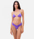 Bikini con top triangolo con drappeggio su coppa; Coppe estraibili; Chiusura con lacci; Slip a brasiliana con laterali alti drappeggiati.